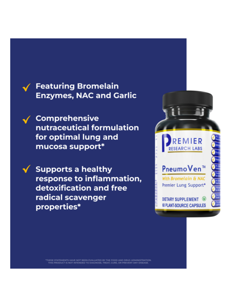 PneumoVen™ provides a superior combination of natural vegetarian enzymes (as bromelain, derived from the pineapple plant), NAC (N-Acetyl-L-Cysteine) and a broad spectrum of selected botanical support agents for effective lung support.* Bromelain offers proteolytic enzymes which promote the breakdown of protein. NAC (N-Acetyl-L-Cysteine) is a source of the essential amino acid, L-cysteine, and is a precursor to the important antioxidant, glutathione. NAC supports detoxification at the liver. Additional biocompatible botanical agents are included for optimal nutritional support.